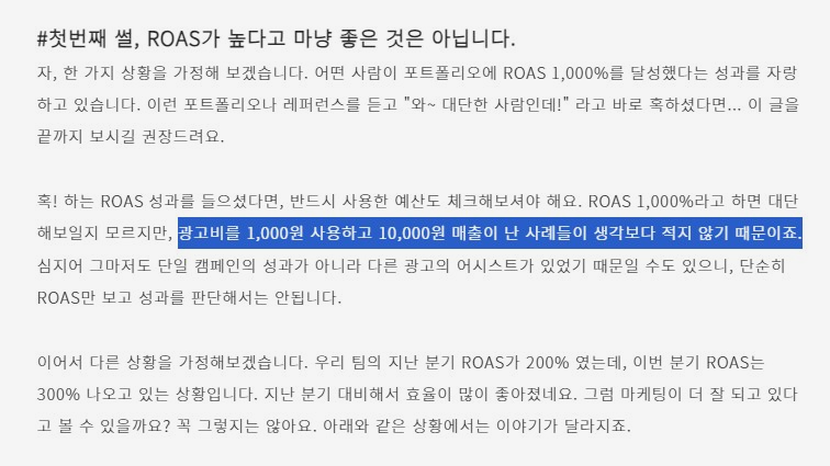 ROAS는, 온라인을 판매도구로 쓰는 모든 사업자가 높이고싶은 수치 입니다. 브런치 https://brunch.co.kr/@seunguk/61 를 참고하시면, ROAS가 높다고 마냥 좋은것은 아니다. 최소 300%는 나와야 한다. 마진률에 따라 다르다 등 내용이 잘 정리되어 있습니다.